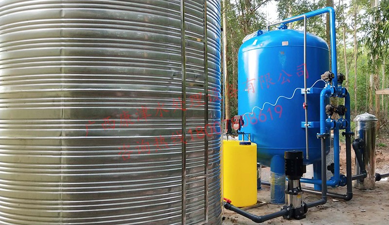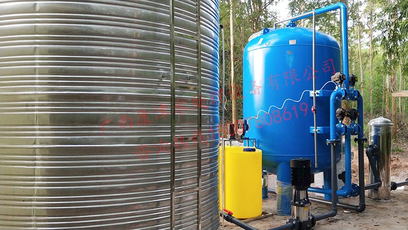 工藝流程:河水-原水箱-石英砂過濾器-精密過濾器-二氧化氯消毒-加壓泵-高位水塔