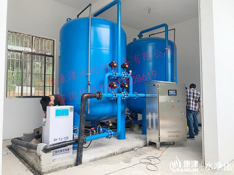 工藝流程:山泉水-二氧化氯加藥器-絮凝投加器-石英砂過濾器-用水點