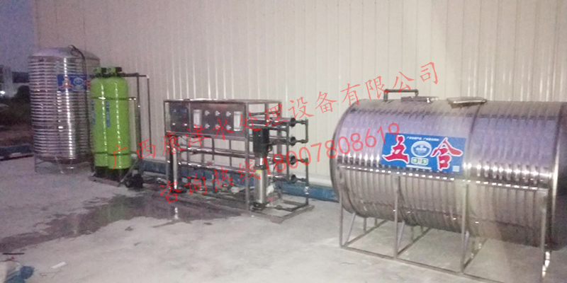 原水→原水箱→原水泵→多介質過濾器→活性炭過濾器→保安過濾器→高壓泵→反滲透裝置→產水箱→用水點